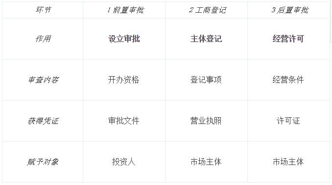 一個(gè)市場(chǎng)主體,從設(shè)立到開(kāi)展經(jīng)營(yíng)活動(dòng)需歷經(jīng)許多審批、許可(或登記)。歸結(jié)起來(lái),與商事登記關(guān)系最密切的可分為三類,一是在進(jìn)行市場(chǎng)主體登記前應(yīng)取得的審批,所謂“前置審批”;二是進(jìn)行市場(chǎng)主體的注冊(cè)登記,取得營(yíng)業(yè)執(zhí)照;三是取得特定經(jīng)營(yíng)項(xiàng)目的許可,所謂“后置審批”。此外,在進(jìn)行注冊(cè)登記前還有一個(gè)“名稱預(yù)先核準(zhǔn)”。 見(jiàn)下表: